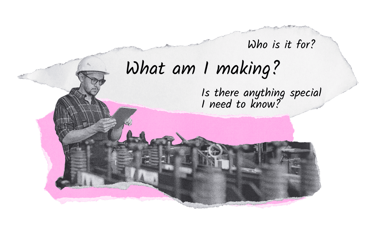 Because floorworkers orient around parts, the design gives visual prominence to the part being built.