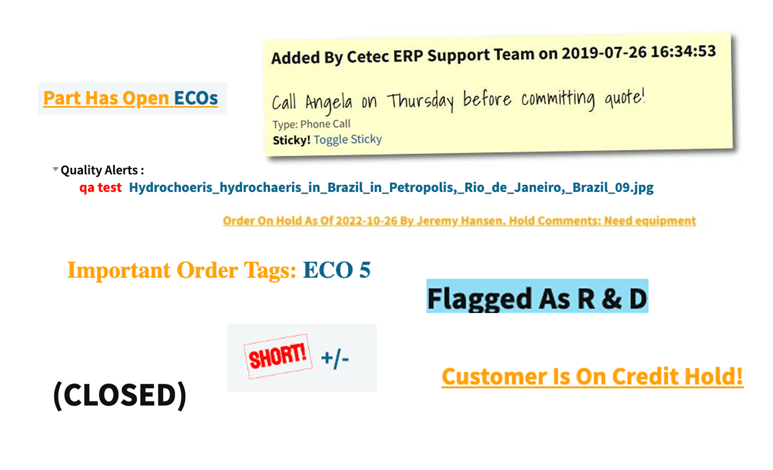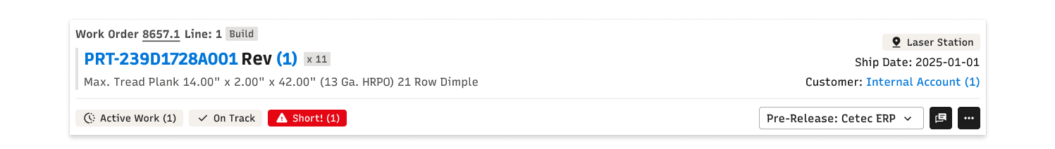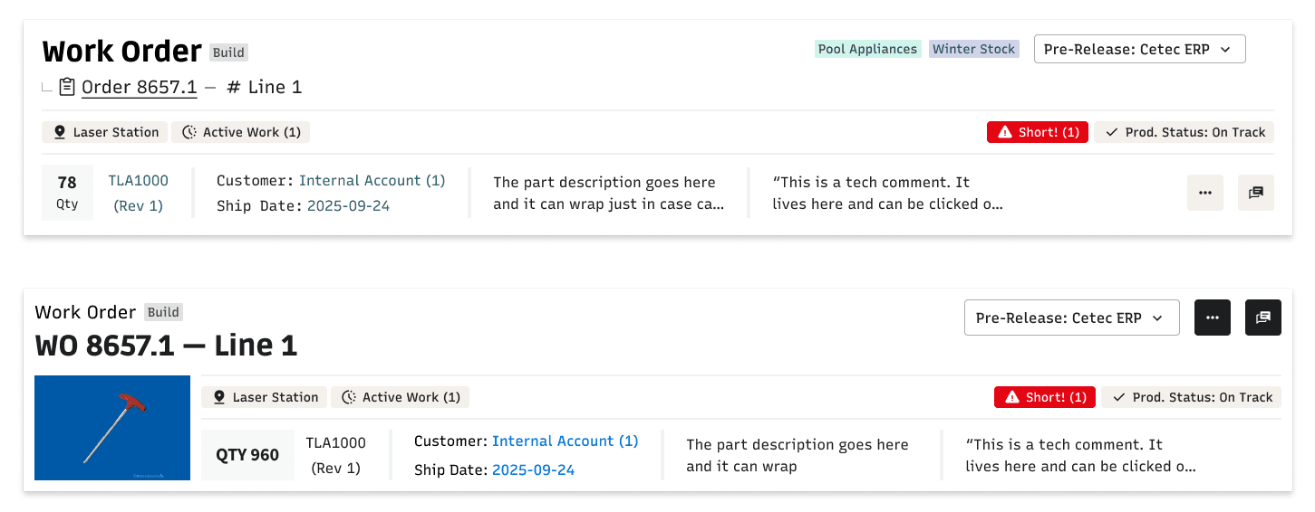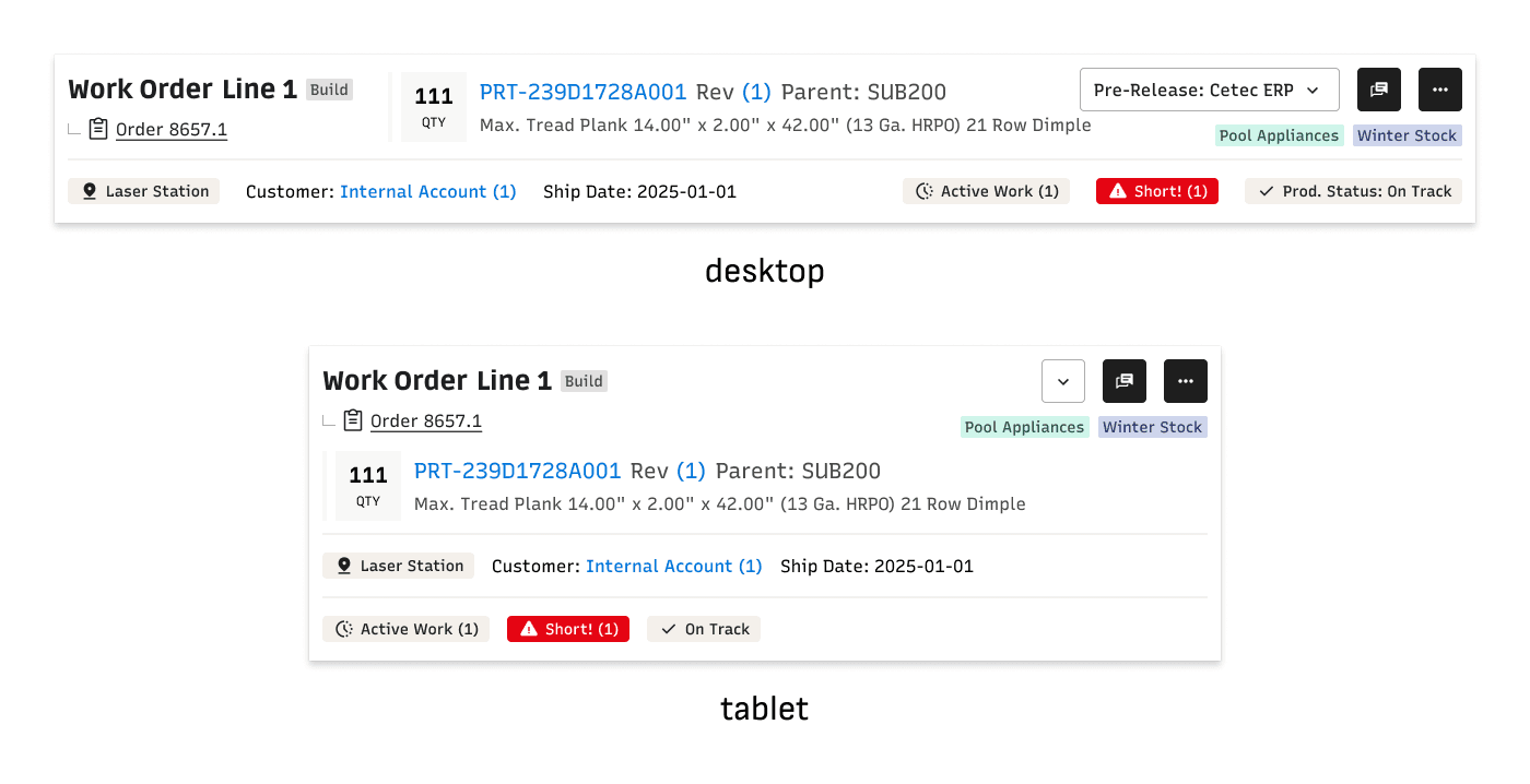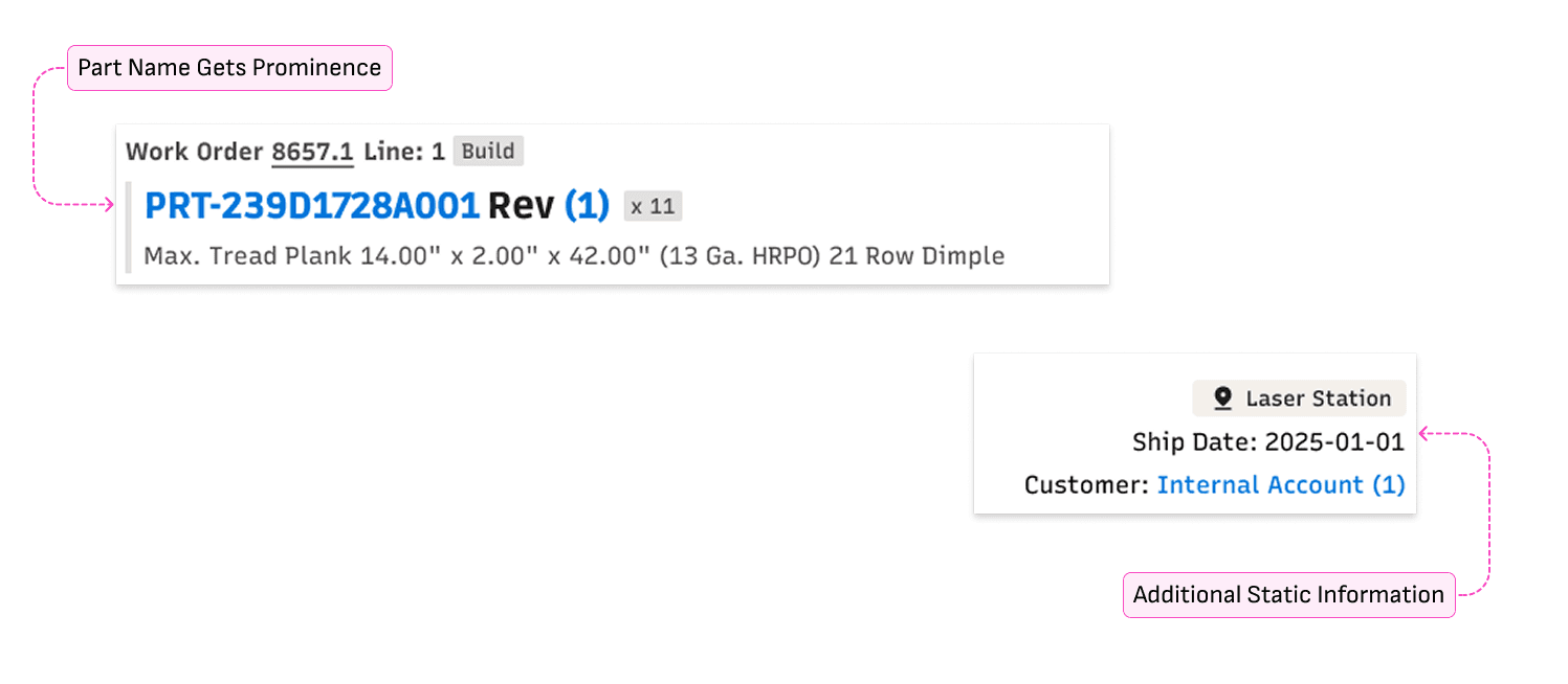 Static information about parts and customers sat alongside dynamic status and alert information without clear differentiation. Alert information was not consistent, either in content or placement. So many opportunities for improvement!