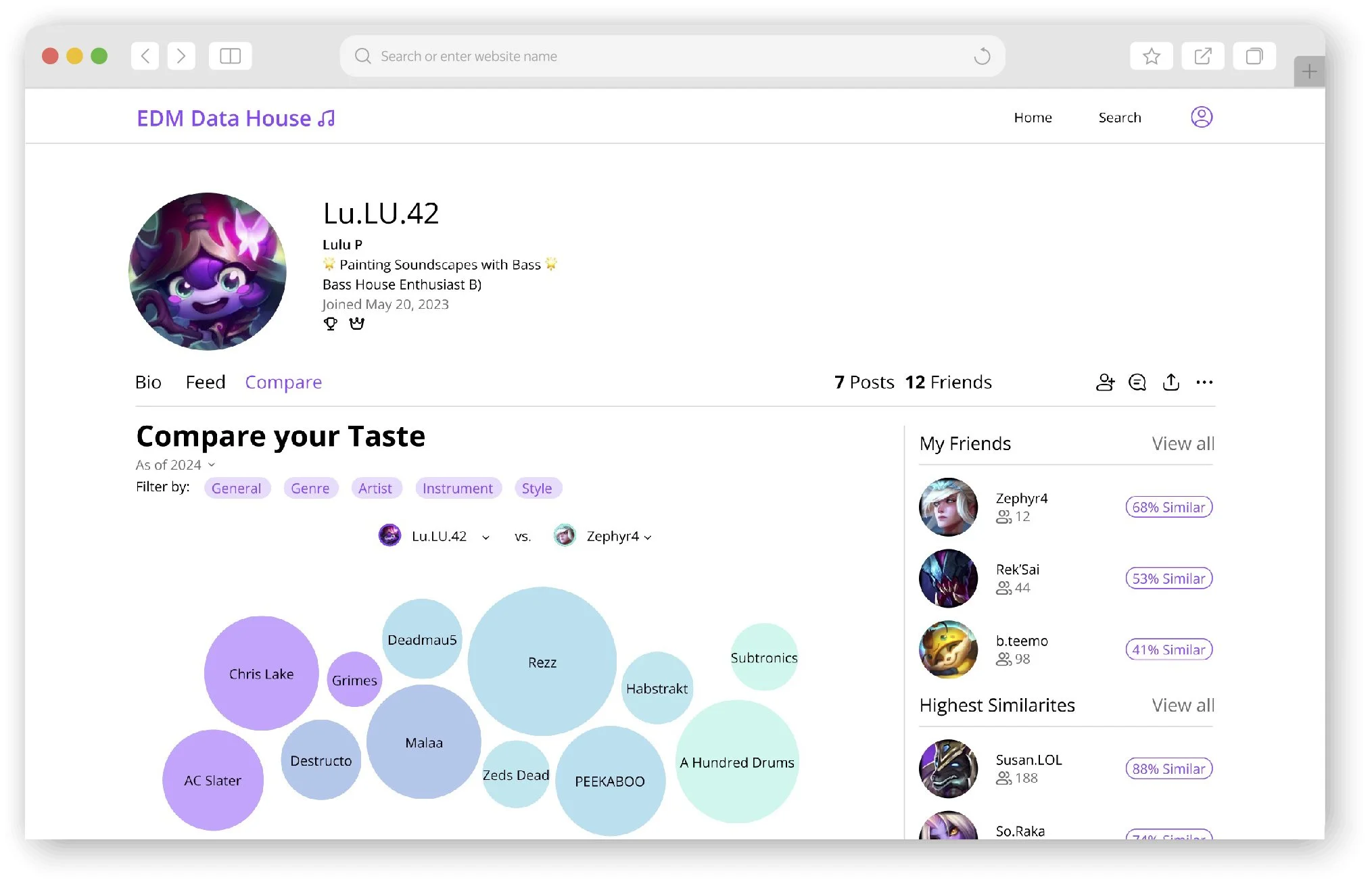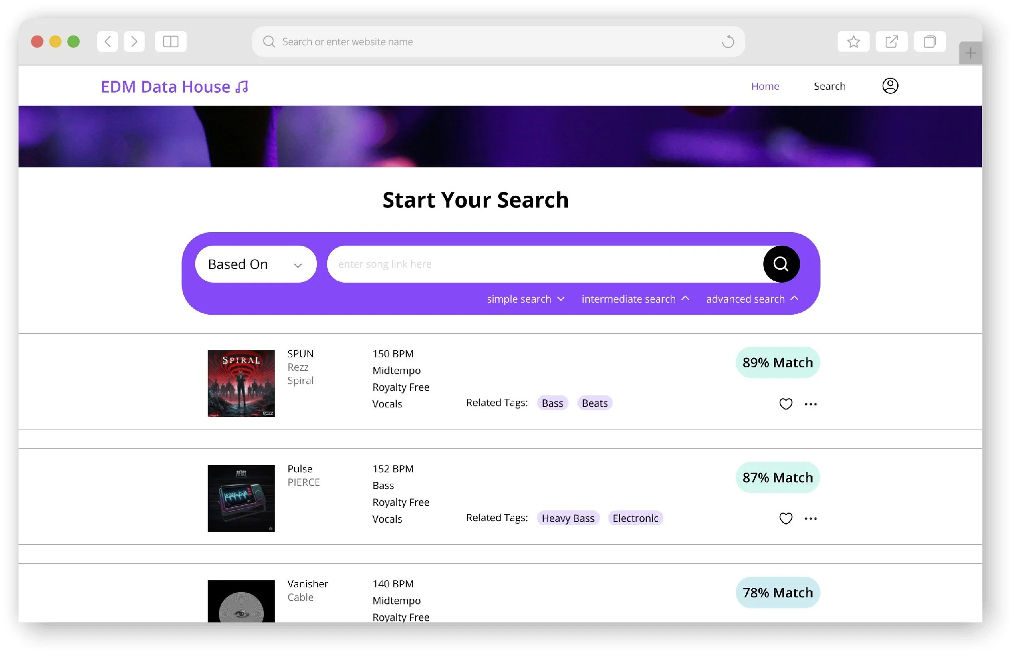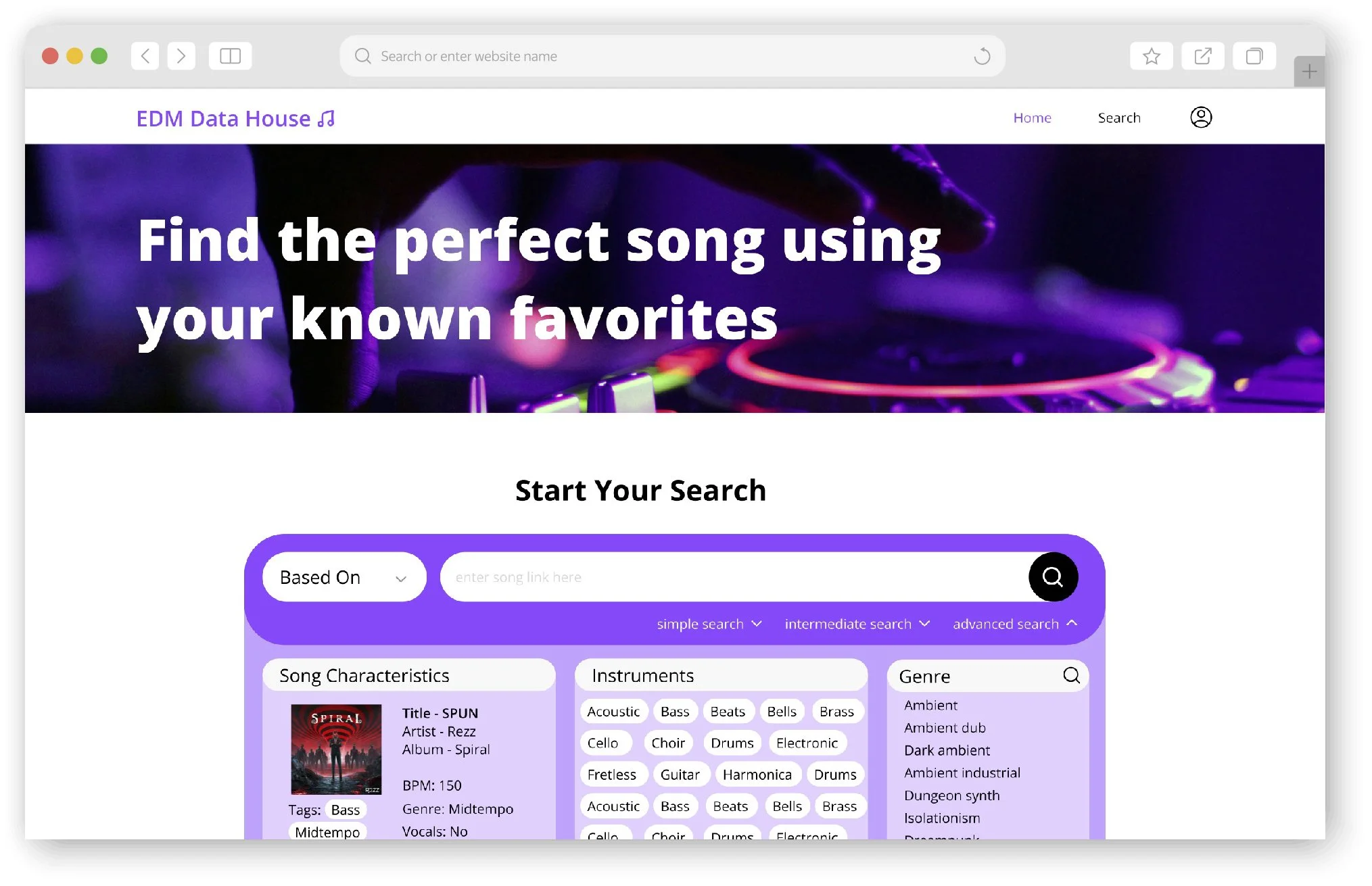 Project Description: Creating a website that helps users search and find new songs based on EDM songs they already enjoy. Map and visualize users’ unique music fingerprint through a profile page.