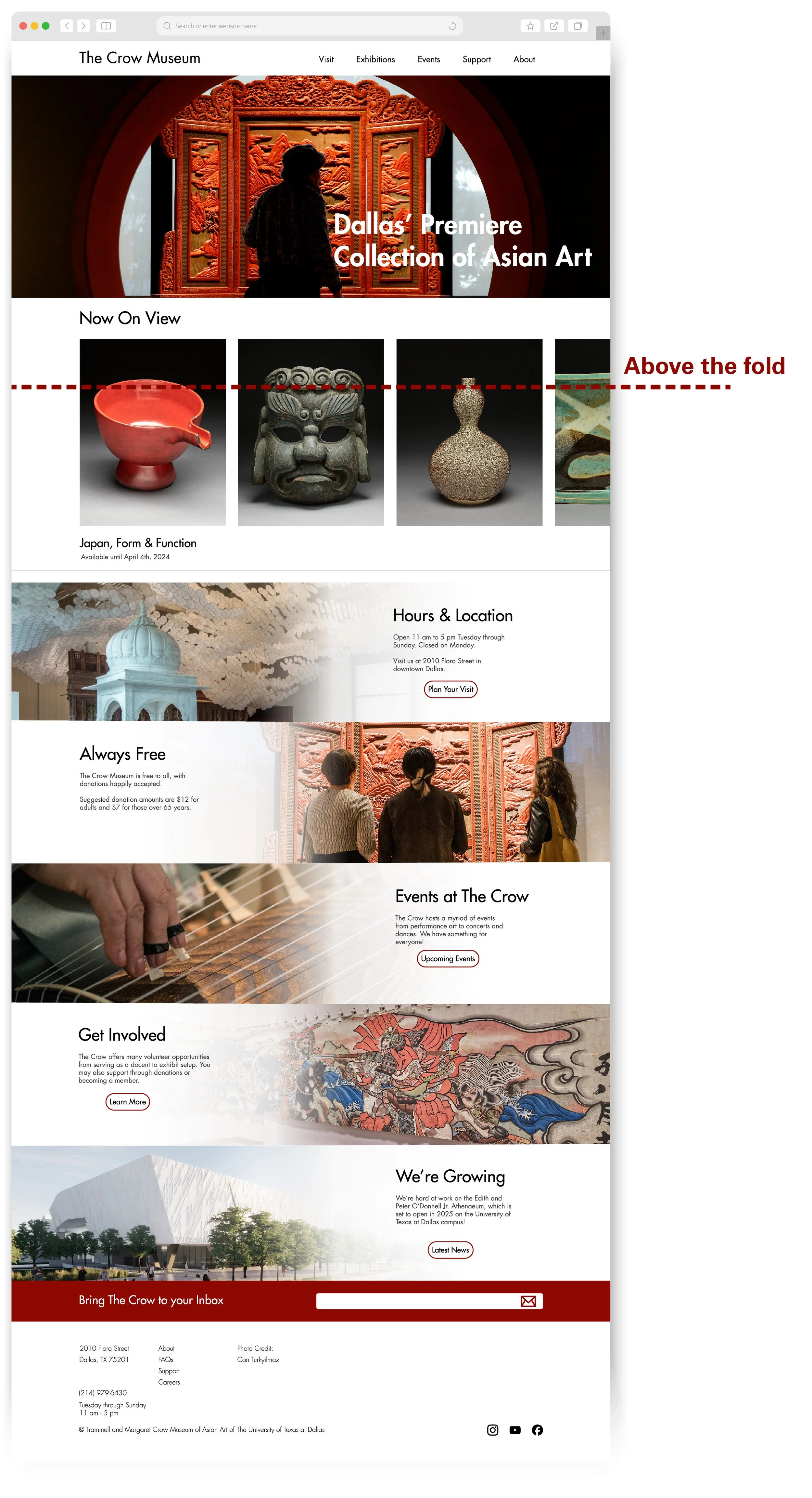 I used a hero image of the Crow’s iconic portal door along with a blurb about the museum. I wanted users to immediately understand what the Crow Museum was all about.